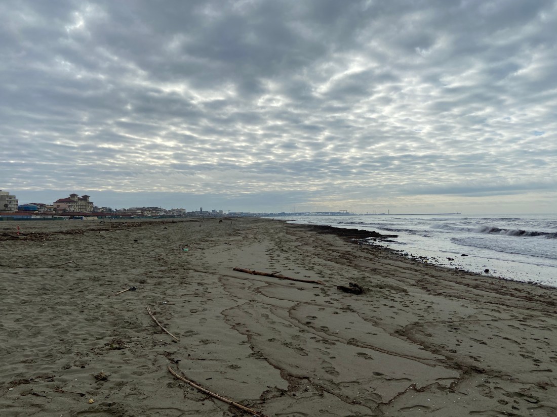 Au matin se promener sur la grande plage noire, d’un côté les installations du port vers Livourne, de l’autre La Spezia et les rochers de Porto Venere qui s’étagent en caps dans la brume. Des nuages noirs flottent sur les montagnes de Carrare. Je marche sur la plage avec la gueule de bois de la veille, avec les problèmes du jour ou du lendemain. Personne sauf quelques quidams avec chiens et masques. Il y une couche d’hôtels de style anglais, genre palaces vieillissants où l’on vous prend votre température, votre passeport et votre carte bleue avec des mines compassées. Puis une couche de ‘Passeggiata’ avec ses petits édifices balnéaires à fronton, puis la plage, large et longue, sinistre sous ce ciel noir. La civilisation balnéaire est à l’arrêt. Je me demande si Pasolini s’est arrêté ici avec sa petite voiture quand il faisait ‘La longue route de sable’. Plus loin il y a Forte dei Marmi, sorte de station snob avec ses magasins de luxe déserts. Mais ici il n’y a rien qu’un marché où on surjoue un peu une jovialité forcée. Les chiens s’inquiètent d’être autant promenés. Dans la salle du restaurant où je prends mon petit déjeuner, jazz compassé au volume minimum, serveur compassé en baskets noires, blondes compassées en jean talons, traînant des longs cachemires coûteux et marchant la tête basse, pour ne pas tomber peut-être. Quelques businessmen qui essayent d’avoir l’air féroce avec leur téléphone et leur costume. Tout ça n’est pas sérieux, ou trop sérieux. Les oeufs brouillés ont des reflets verdâtres, le thé est tiède. L’humanité est véritablement à bout ici comme ailleurs. Ce qui était un plaisir est devenu une douloureuse comédie. Ce qui était le sens des choses n’est plus qu’un vent de sable.