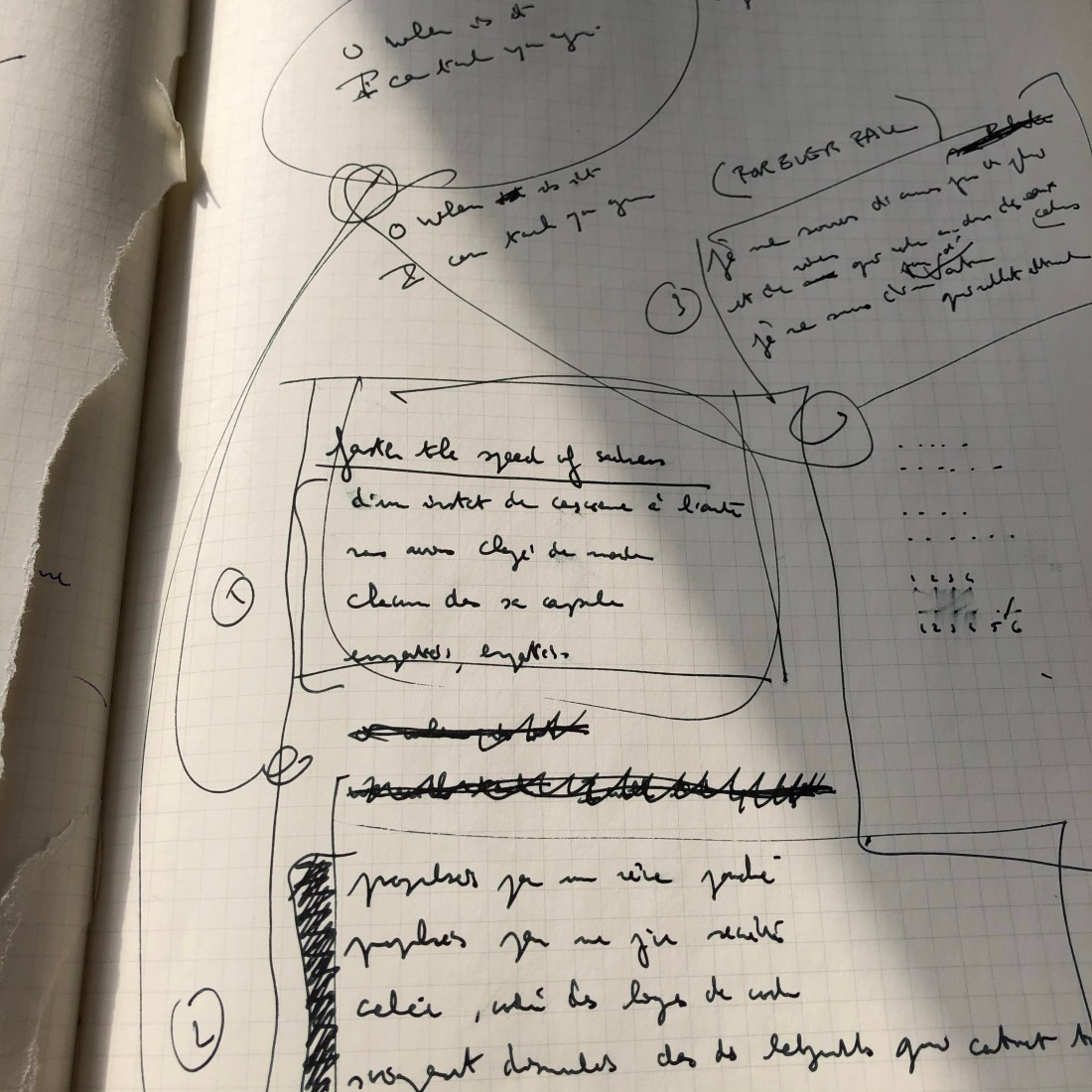 (Instrumental. Les gens dans leurs appartements de l’immeuble d’en face. La vie mode d’emploi. Chorégraphie. Ils bougent, ils dansent dans la lumière de leur appartement qui est comme un fluide doré, un liquide amniotique, une ‘grasse liqueur’ qui bouge après eux en remous. Inhalent et expirent des particules brillantes. Créatures sous-marines. Demi-dieux et déesses. La nuit, la phosphorescence bleue de leur téléphone portable virevolte autour de leur tête comme le filament pêcheur d’une baudroie.)
