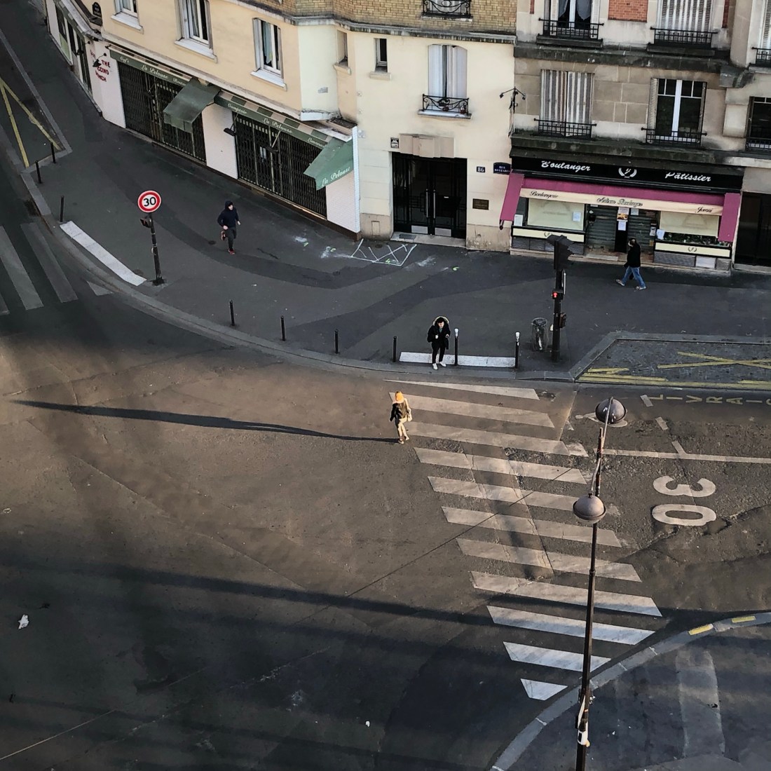 L’air est de plus en plus transparent, ce que certifie Airparif. Et nous aussi, recroquevillés que nous sommes, confinés, logés, rangés comme des accessoires inutiles dans une réserve. L’air est de plus en plus froid aussi, et nous cherchons le sens de tout cela comme Swann cherchait Odette en parcourant Paris dans sa victoria. Printemps glacial… Les ombres portées des immeubles sur le bitume sont de plus en plus nettes, ces immeubles qui acquièrent une autorité de falaises, de canyons, de concrétions géologiques immémoriales. De nous débarrassées, en quelque sorte. Les rares piétons rasent les murs, se voûtent, deviennent transparents et flous et leur démarche n’occupe plus du tout l’espace en propriétaire. Ces falaises sont remplies de gens qu’on ne voit plus, et qui se demandent s’ils existent encore. On voudrait exister pour les autres, en obédients petits lemmings, et voilà qu’il faut exister en mode autonome, en conserve, en réserve. Notre monde bruyant et tout rempli de vraies-fausses intentionnalités à notre égard, nous est dénié. Il nous faut fonctionner sans téléphone qui sonne, sans pétrolettes qui pétaradent, sans klaxon et sans… occupation. Nous sommes condamnés à la vacance, à la béance existentielle. A quoi servons-nous, au fait ? Notre monde, là, sous nos fenêtres, se détache gentiment et part dérive comme un inlandsis, débarrassé de notre décorum, de nos us et coutumes, de notre fatras, de notre comédie et de notre bruit. C’est très troublant, encore que très beau.