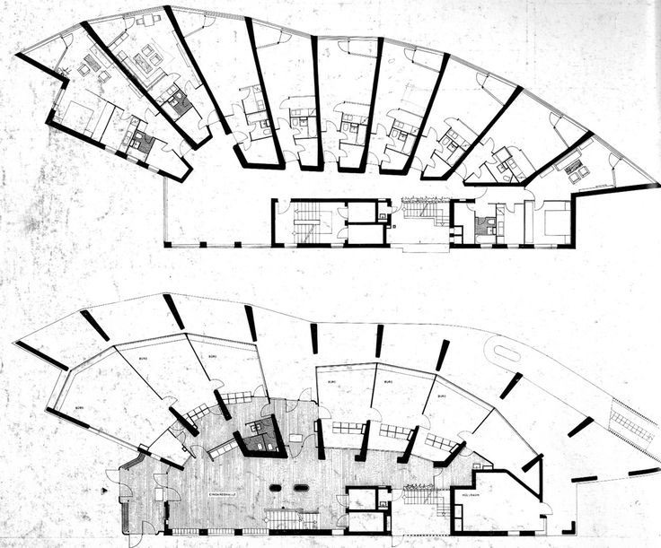 ** Alvar Aalto, Immeuble Neue Vahr, Brême, 1957, plan du rez-de-chaussée et d’un étage courant.